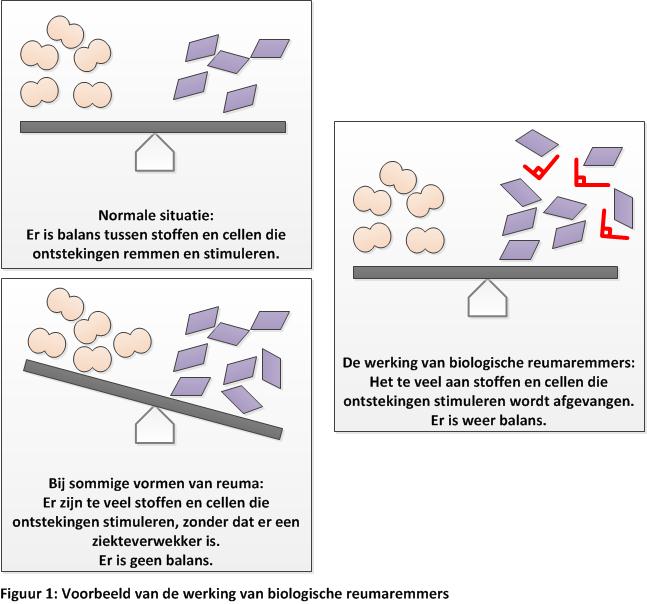 Ook biologische reumaremmers onderdrukken de gewrichtsontstekingen door het afweersysteem te beïnvloeden. Ze worden biologisch genoemd, omdat ze uit stoffen bestaan die lijken op stoffen die al in het lichaam voorkomen. Omdat biologische reumaremmers het afweersysteem onderdrukken en omdat ze erg kostbaar zijn, worden ze ingezet bij patiënten die een actieve reuma hebben en minimaal 2 klassieke reumaremmers geprobeerd hebben. Biologische reumaremmers werken als volgt: Gezonde mensen hebben in hun bloed een balans tussen stoffen en cellen die ontstekingen remmen en ontstekingen stimuleren (Zie figuur 1). Op het moment dat er een ziekteverwekker in het lichaam komt, komt er een ontstekingsreactie op gang: de stoffen en cellen die de ontsteking stimuleren vermeerderen zich en gaan in de aanval. Die plek wordt warm, rood, gezwollen en pijnlijk. Wanneer de ziekteverwekker verwijderd is, herstelt normaliter de balans weer tussen de stoffen en cellen die ontstekingen remmen en ontstekingen stimuleren. De ontsteking verdwijnt weer. Als er te veel stoffen en cellen aanwezig zijn die een ontsteking stimuleren zonder dat hier een oorzaak voor is, kan dit problemen veroorzaken. Dit is het geval bij een auto-immuunziekte zoals Reumatoïde Artritis, Artritis Psoriatica en de ziekte van Bechterew. Het afweersysteem is dan overactief en er is geen balans tussen stoffen en cellen die ontstekingen remmen en stimuleren. Door de stoffen en cellen die de ontsteking stimuleren met medicijnen af te vangen, wordt de balans weer hersteld en de ontstekingsreactie gestopt.